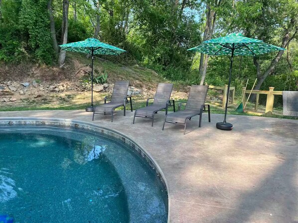 The sunny patio Outback has a private in ground heated pool with a large waterfall flowing into it.. The Patio has plenty of seating and is complete with a charcoal Grill, fire pit, Outdoor sofa and lounge chairs. Turn the lights on at the pool at night and sit along the bench seats in the pool and enjoy the beautiful night sky. We have beach towels for your use. Since this home is in the woods there is plenty of wildlife and bugs that we share the outdoors with. We have citronella candles and bugspray for your use.