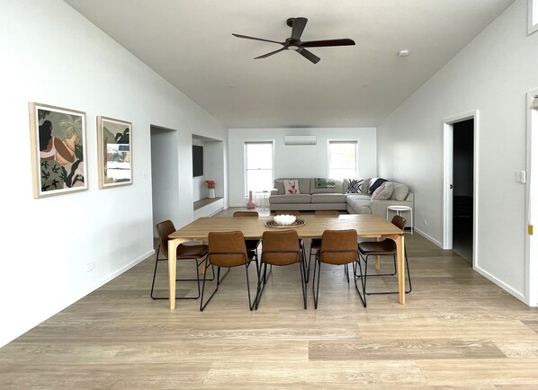 Raked ceilings, open-plan kitchen/living/dining opens to alfresco deck and second patio. BBQ, outside dining setting. Outside sitting area for a sneaky afternoon beverage or two.