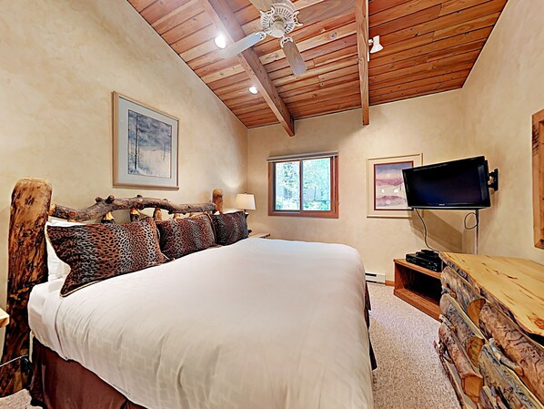 When the day has been packed with all of the activities desired and it's time to head to bed, you'll have no trouble getting a good night's sleep in the comfort of the master bedroom. A plush king bed awaits, outfitted with high quality linens. The rustic log bedframe and dresser in this room add a distinct mountain cabin feel. A wall-mounted flatscreen TV tucked into the corner adds additional options for ending your day on a leisurely note. The main level bathroom is located right across the hall from the master and offers a spacious walk-in tile shower. An additional sink is located right outside the bathroom for added convenience with multiple travelers. To reach the loft, head up the winding staircase that ascends from the kitchen area. This cozy sleeping area offers three twin beds, as well as the added convenience of a full en suite bathroom.