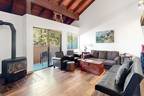 Overlooking the wooded property grounds, your studio with a loft boasts vaulted wood-beam ceilings, a fireplace, and a modern open layout. The full kitchen is well-equipped for prepping your favorite recipes, and there’s plenty of space to gather for mealtime, board games, and puzzles between the living and dining areas. Step out on the furnished balcony for a breath of fresh mountain air anytime.