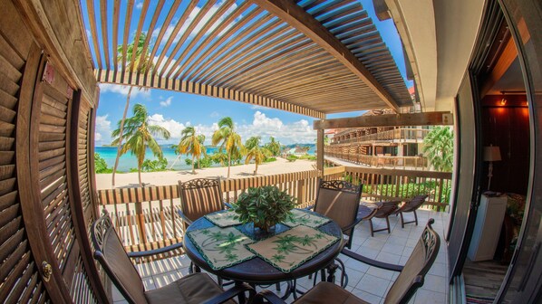 Incredible views of Sapphire Beach! Corner unit, 2nd floor privacy, Keyless entry! We also own the unit (beachfront) below it so if you need additional accommodations due to wedding, family reunion or traveling with friends, please check out our other VRBO listing #720774. Completely remodeled August, 2019 - Floor to ceiling! Included are chaise lounges, table & chairs, appliances, new 2019 dishwasher, high-speed WIFI included, 2 sets of snorkeling gear, King Bed that is super comfortable, all new amenities, blender, coffee maker, hair dryer, (1) large flat screen TV, air conditioning & 2 new ceiling fans; double sliding glass doors that open onto the deck; umbrellas, beach towels & amazing sunrises included. The rates quoted are for two guests ONLY.