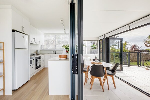 Appartement sur la plage avec une cuisine et un balcon