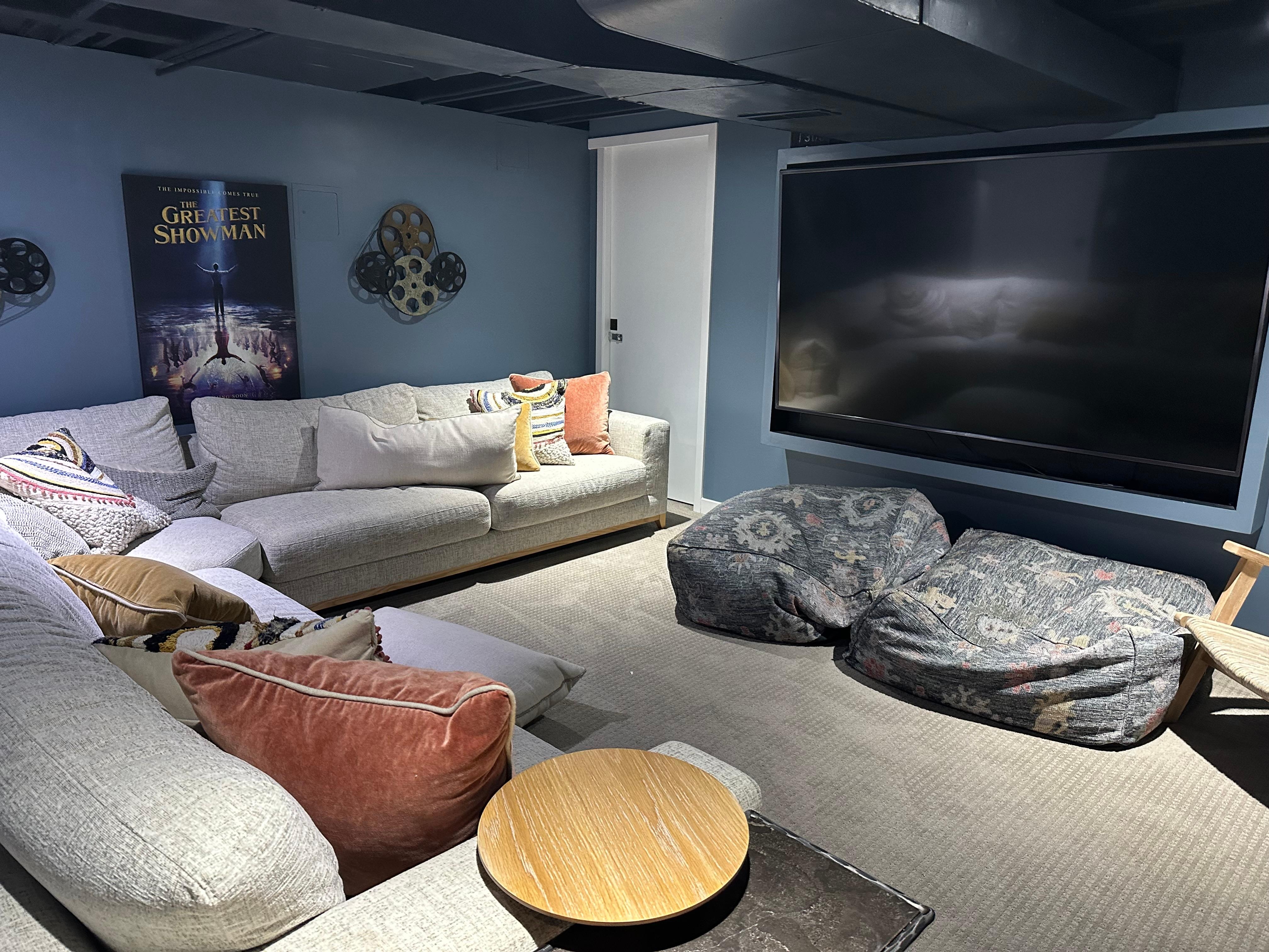 Enjoy the incredible movie room in the basement, with a huge tv and oversized couch and ottomans, plenty of space for everyone to spread out and relax. Additionally, the cottage provides essential amenities such as a highchair, a pack-and-play portable crib, and a baby gate, ensuring a stress-free stay for families with young children.