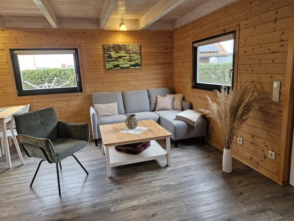 3 cottages for up to 4 people in the Mecklenburg Lake District. Ideal for larger or friendly families. You are on vacation! Just wake up with the sun and give the alarm clock a break. Is there a better awakening than knowing that a wonderful day is ahead of you? After breakfast on the terrace of your holiday home, you will be spoiled for choice: a beach holiday at the large Labevalene Lake, which is only a few steps away, canoe trips with a canoe reserved for you or hiking and cycling tours in the surrounding area. Our built in 2006 houses in log cabin style, located in a quiet village location overlooking water and forest. Each of the three cottages has a modern living room area with kitchen, equipped with two-plate stove, toaster, mini oven, fridge freezer, microwave and coffee maker and bathroom with shower and toilet. In the attic there are two separate bedrooms with one double and two single beds. The facilities of the houses include: satellite TV, barbecue and garden furniture. For the little ones are by appointment a highchair and a travel cot available. Fresh bread rolls and goods for daily needs can be obtained from the nearby campground if booked in advance.