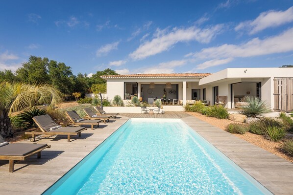 Les espaces extérieurs sont aménagés pour que vous puissiez profiter pleinement de la piscine, des terrasses et du jardin.