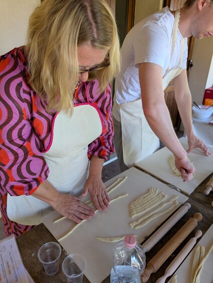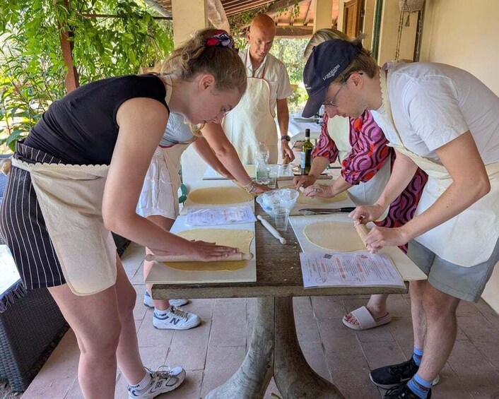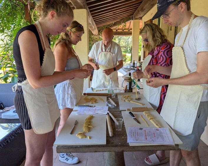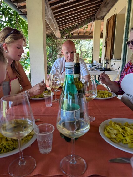 A shared experience that includes making fresh handmade pasta, a full lunch, and local wine produced in the surrounding vineyards.