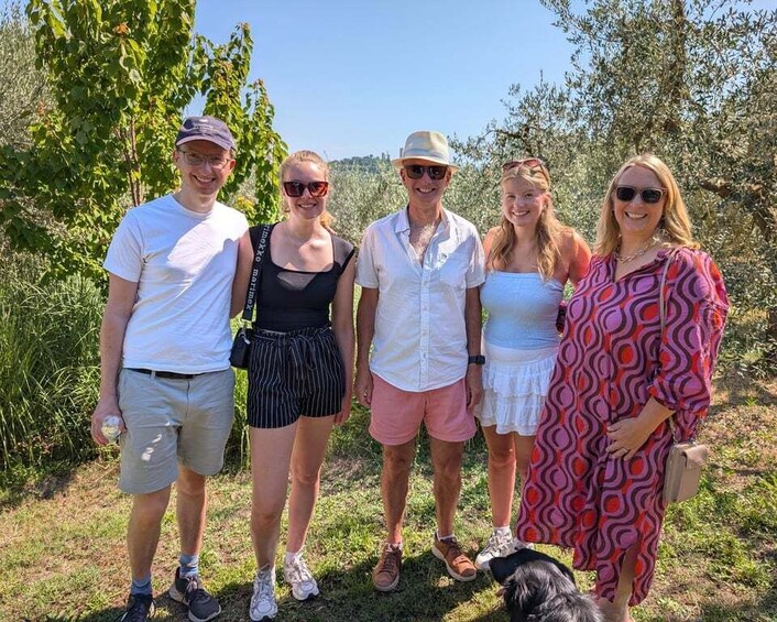 An outdoor Tuscan cooking experience, among vineyards, cypress trees, and rolling hills, in a casual and friendly atmosphere.