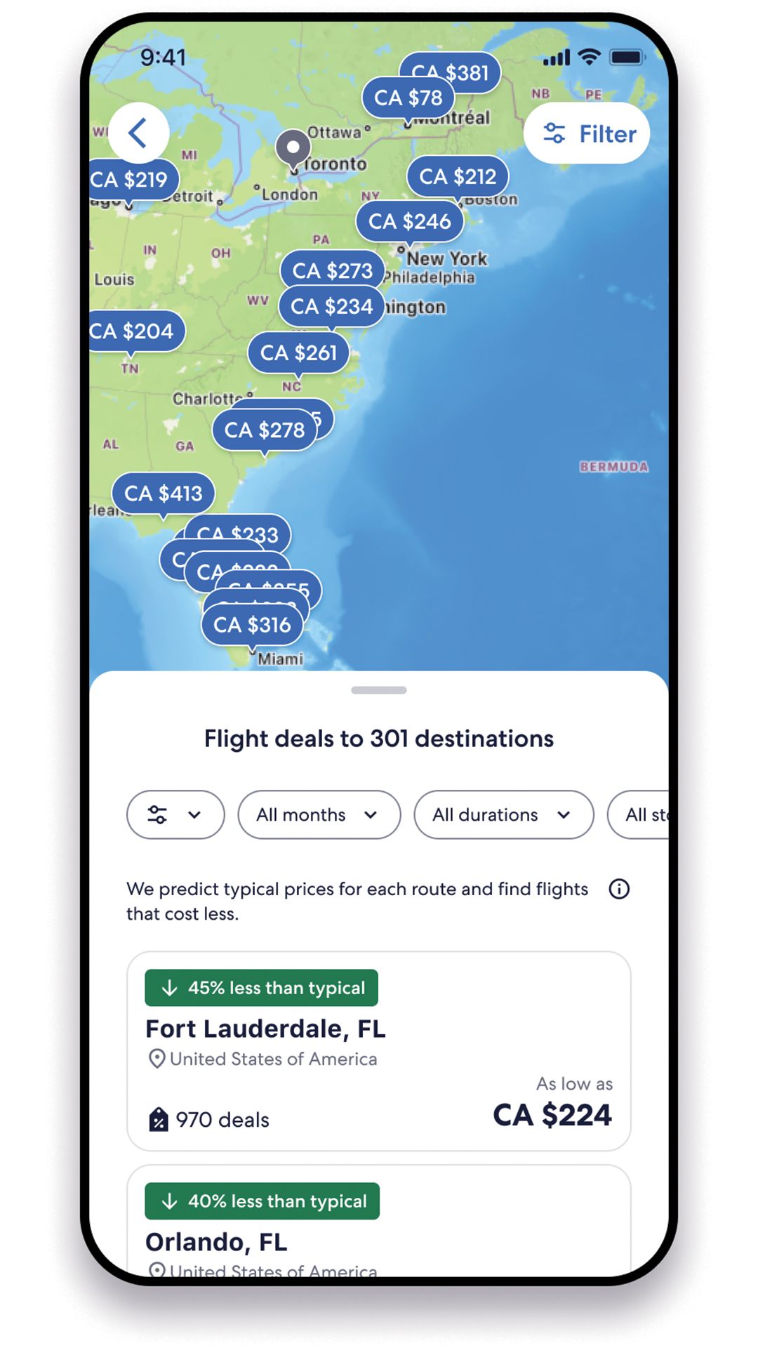 Expedia’s Flight Deals tool on the app scans millions of flights daily to find quality flights from your chosen airport that are at least 20% lower than typically predicted prices for that route. The tool features a new interactive map feature to compare destinations, custom deal alerts and allows travelers to filter by destination and travel date
