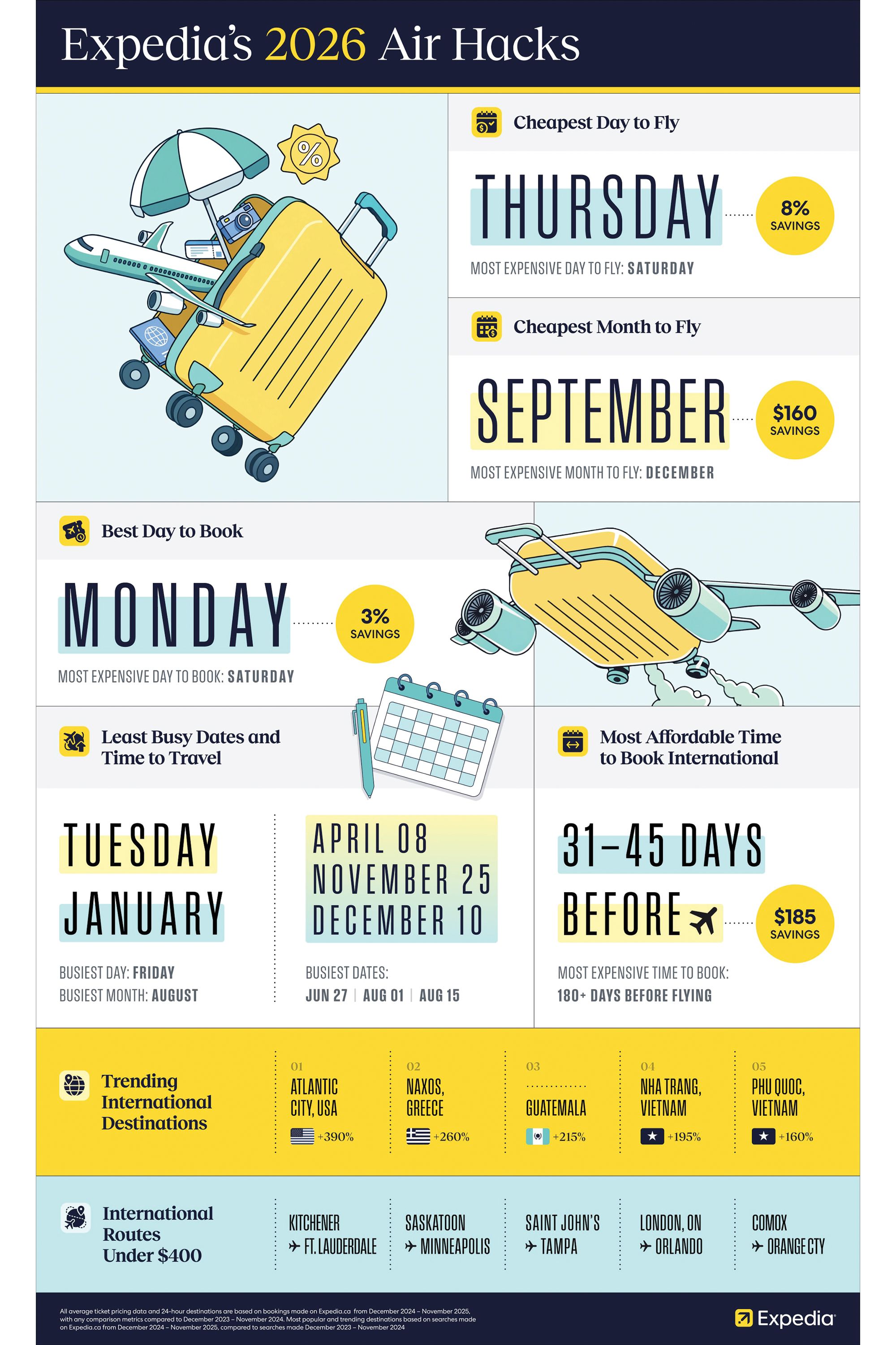 All average ticket pricing data and 24-hour destinations are based on bookings made on Expedia.ca from December 2024 – November 2025, with any comparison metrics compared to December 2023 – November 2024. Most popular and trending destinations based on searches made on Expedia.com from December 2024 – November 2025, compared to searches made December 2023 – November 2024