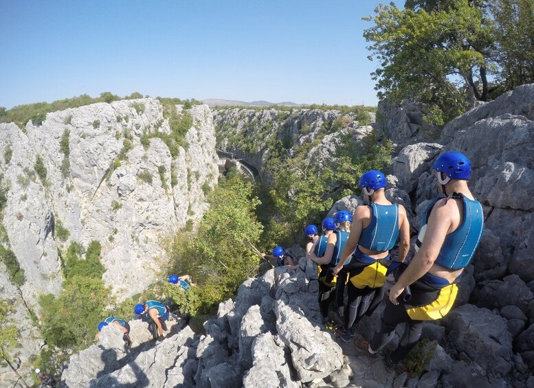 Votre excursion de canyoning commence à Omiš, d’où vous voyagerez en mini bus jusqu’au village de Zadvarje. Pendant le transfert, vous profiterez d’une vue panoramique sur Brac, Hvar, Vruja Bay et Biokovo Mountain. Une fois que vous arrivez à Zadvarje, vous serez fourni avec 5 millimètres canyoning neopren, un casque, un gilet de sauvetage, et un harnais de canyoning.